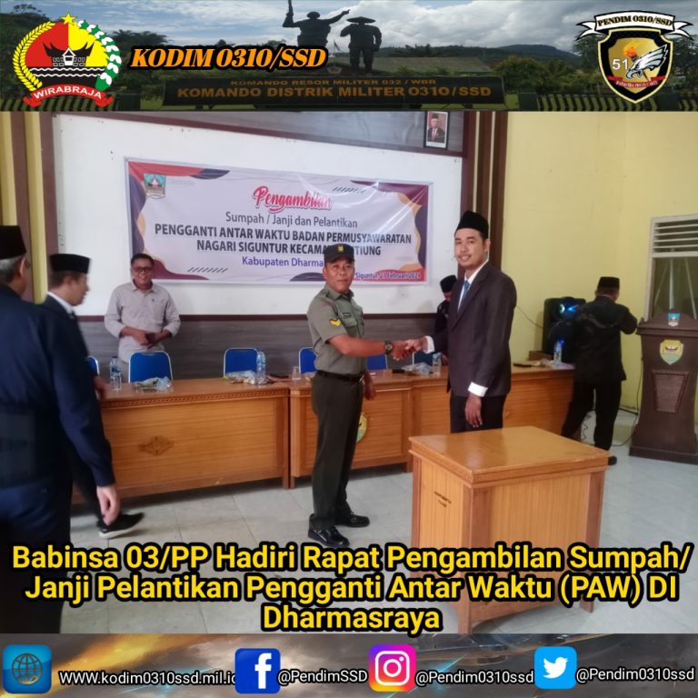 Pelda Joko Sumarno Babinsa Nagari Sungai Dareh Kecamatan Pulau Punjung Kabupaten Dharmasraya Koramil 03/PP Kodim 0310/SS menghadiri undangan Ketua Kerapatan Adat Nagari Sungai Dareh Kecamatan Pulau Punjung di Aula Pertemuan Nagari Sungai Dareh. Rabu (15/10/2025). Kegiatan dihadiri, Wali Nagari Sungai Dareh bapak Irwandi, ST, Ketua KAN Sungai Dareh bapak Zulkifli Lenggang Majo, Ketua Bamus bapak…