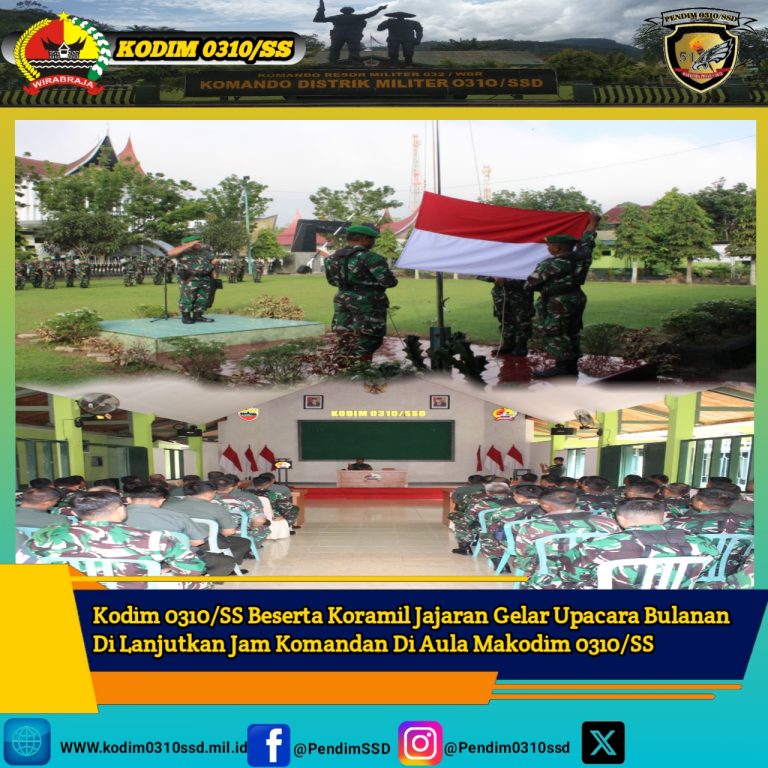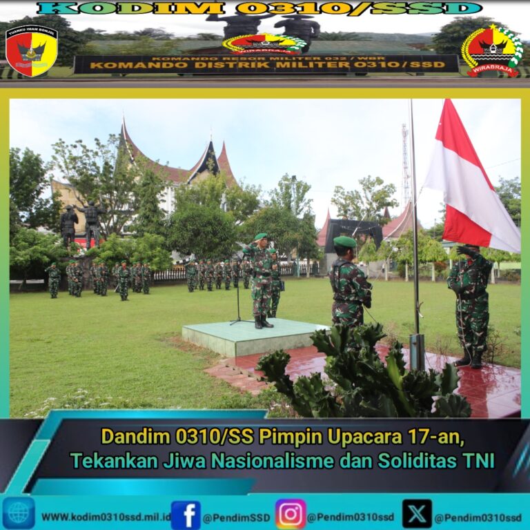 Dandim 0310/SS Pimpin Upacara 17-an, Tekankan Jiwa Nasionalisme dan Soliditas TNI Sijunjung -Komandan Kodim 0310/SS Letkol Czi Joko Stradona, S.T Pimpin upacara bendera 17-an sebagai bentuk penghormatan kepada para pahlawan dan peneguhan semangat pengabdian kepada bangsa. Upacara berlangsung di Lapangan Makodim 0310/SS pada Jumat (17/10/2025). Kegiatan tersebut diikuti oleh seluruh prajurit dan PNS Kodim 0310/SS…