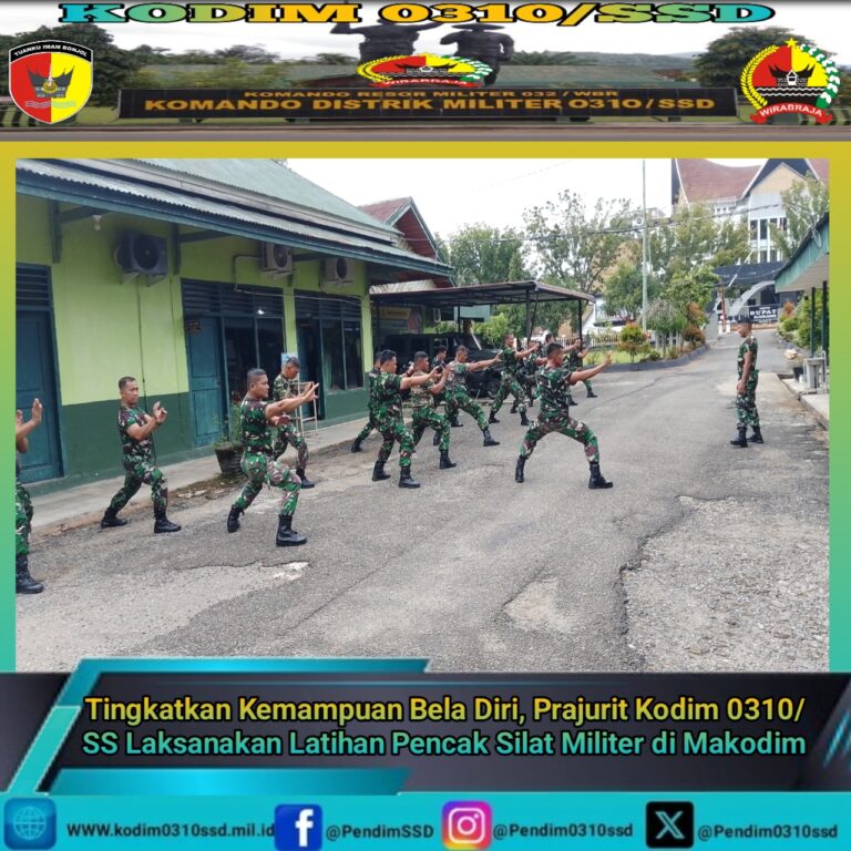 Sijunjung – Dalam rangka meningkatkan kemampuan bela diri dan ketangkasan prajurit, anggota Kodim 0310/SS melaksanakan latihan Pencak Silat Militer (PSM) yang digelar di Makodim 0310/SS. Senin (17/10/2025). Kegiatan ini dipimpin langsung oleh pelatih Pencak Silat Militer dan diikuti oleh seluruh prajurit Kodim dengan penuh semangat. Latihan PSM merupakan bagian dari pembinaan fisik sekaligus upaya menjaga…