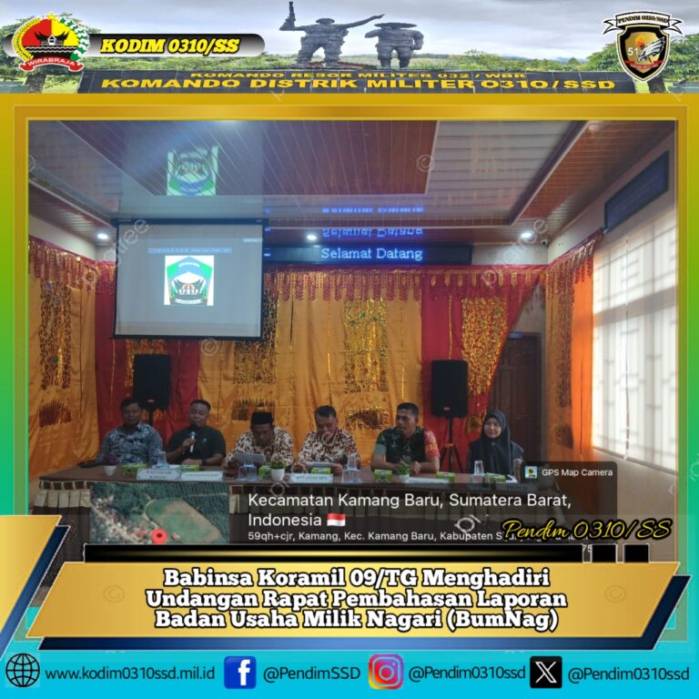 𝐒𝐢𝐣𝐮𝐧𝐣𝐮𝐧𝐠, PLh Danramil 09/TG Kapten Inf Mondrayadi diwakili oleh Babinsa Serka Donald menghadiri Undangan dalam rangka Rapat Pembahasan Laporan Badan Usaha Milik Nagari (BumNag) di Beringin Gadang, Nagari Kamang Kab. Sijunjung Tahun Anggaran 2025. Jum’at (13/02/2026). Rapat ini berlangsung di Aula Kantor Nagari Kamang Kec. Kamang Baru Kab. Sijunjung, pada acara ini hadir Camat Kamang…