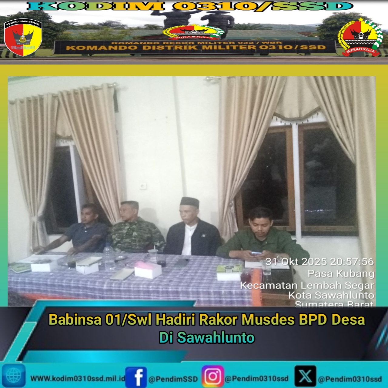 Babinsa Koramil 01/ Swl Menghadiri Undangan Rapat BPD Desa Pasa Kubang Dalam Rangka Perubahan Anggaran 2026 Dan Musyawarah Tentang Pelaksanaan Ronda Malam Bertempat Di Aula Desa Pasa Kubang Kec Lembah Segar Kota Sawah Lunto Sabtu (01/10/2025).