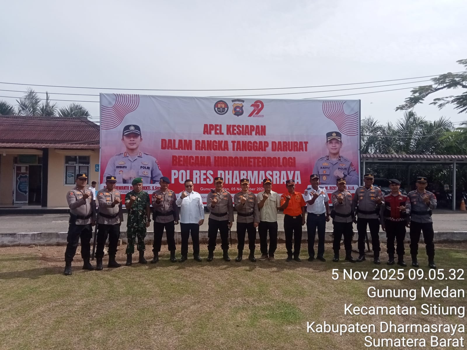 Komandan Kodim 0310/SS Letkol Czi Joko Stradona, S.T yg di wakili Plh Danramil 03/PP Peltu Agus Rinalto melaksanakan Upacara Apel Kesiapan Dalam Rangka Tanggap Bencana tahun 2025. dilapangan Apel Polres Dharmasraya. Rabu (05/11/2025).